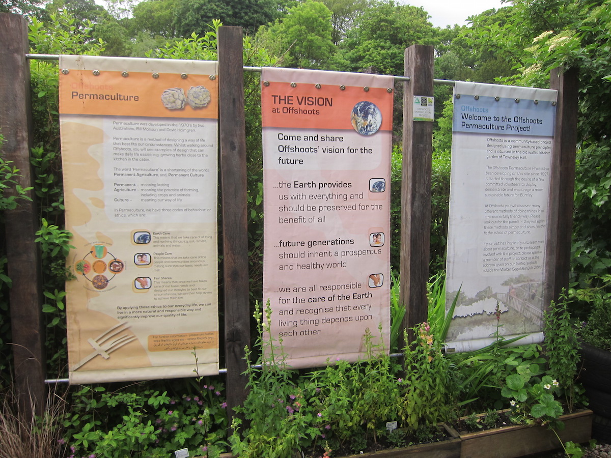 Offshoots, set within Towneley Hall, Burnley’s largest park, holds a unique space in the 180 hectares of landscaped parkland. What was once a forgotten Victorian walled kitchen garden is now an accessible public Permaculture project. On roughly an acre of land the site layout, more or less true to the original design plan from the foundational PDC (Permaculture Design Certificate course) in 1997, has a lot going on. Rows of veg are overlooked by the Walter Siegel cabin which is a stone’s throw from the compost loo and right next to the Apiary from where bees forage amongst the multiplicity of close by plants.