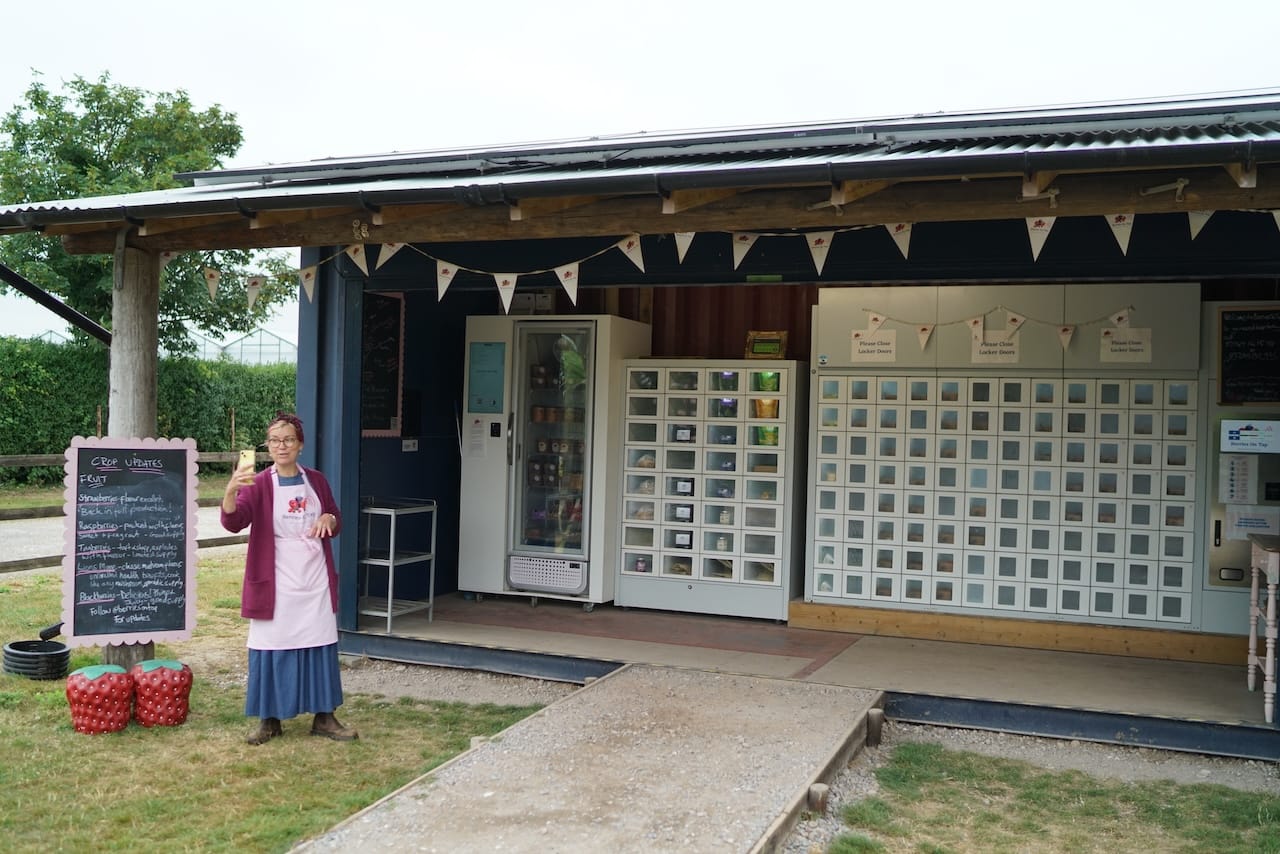 I met Kathy Evans at the entrance to the farm beside their impressive vending machine, housed inside a converted shipping container. Customers were already stopping to buy fresh punnets of berries grown just 20 metres away in their glasshouse.