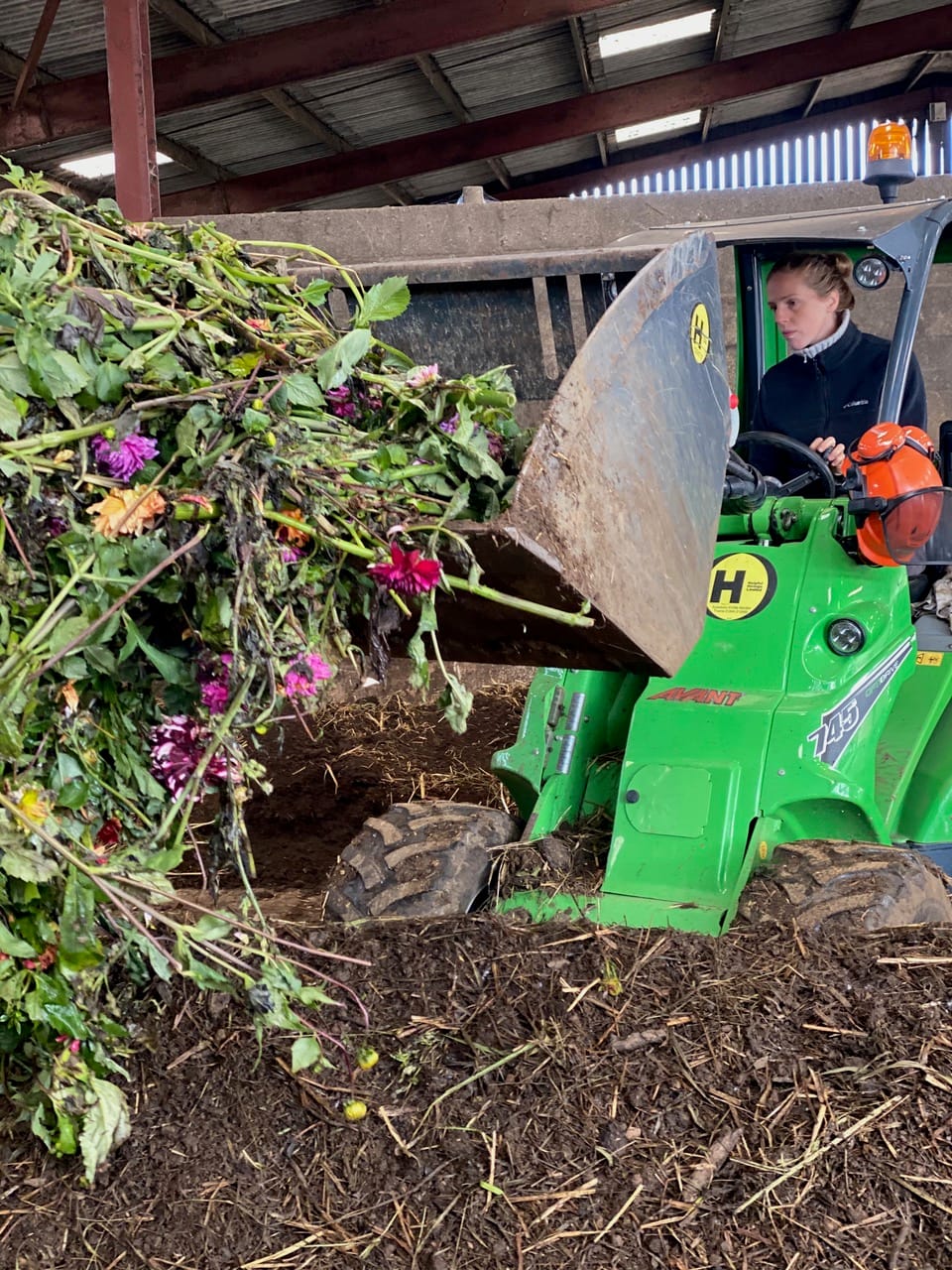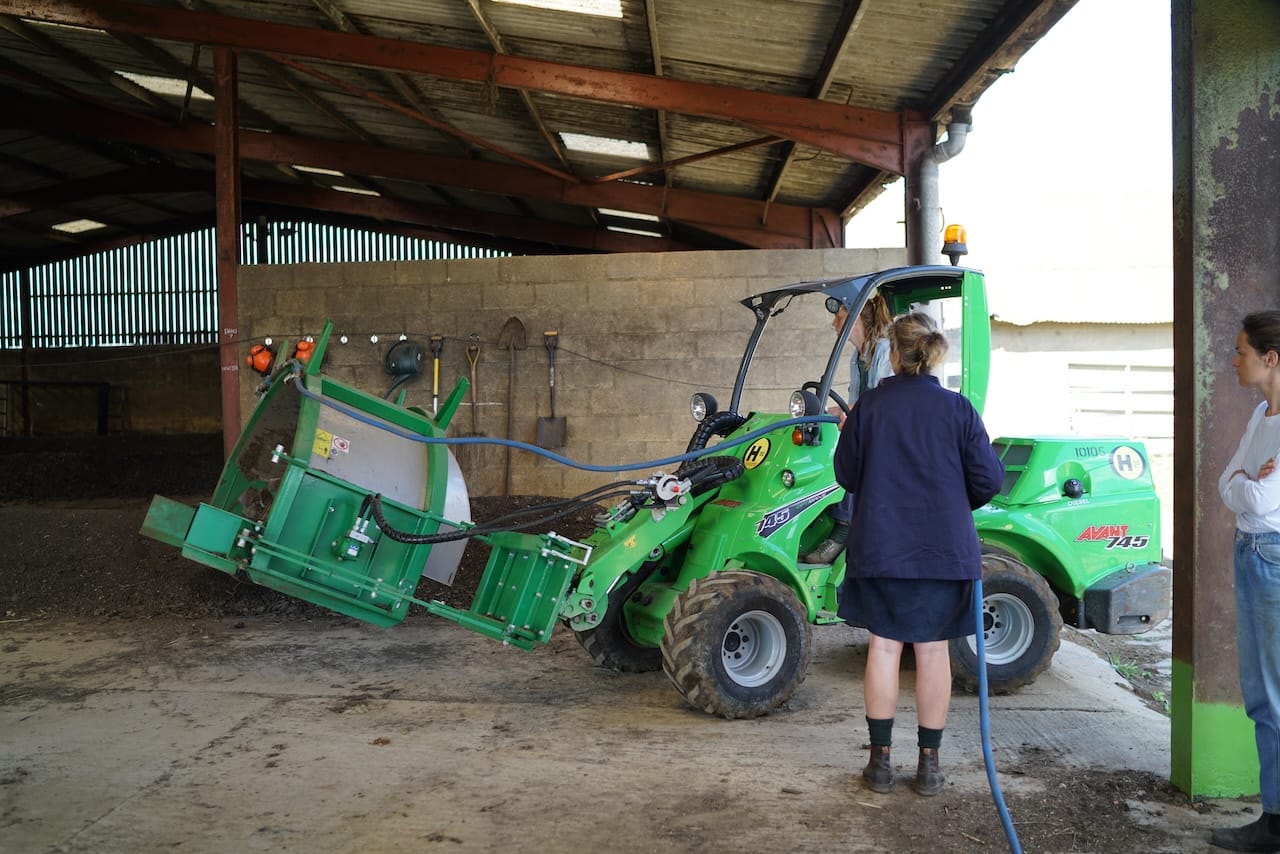 The buildings contained several long windrows of compost on a concrete floor. In the corner was an intermediate bulk container (IBC) filled with carbon filtered water and an electric pump. Catie Jarman, who is coordinating the compost at the Land Gardeners, hooked the compost turner on to an Avant – a small green loader – with a little help from Bridget.