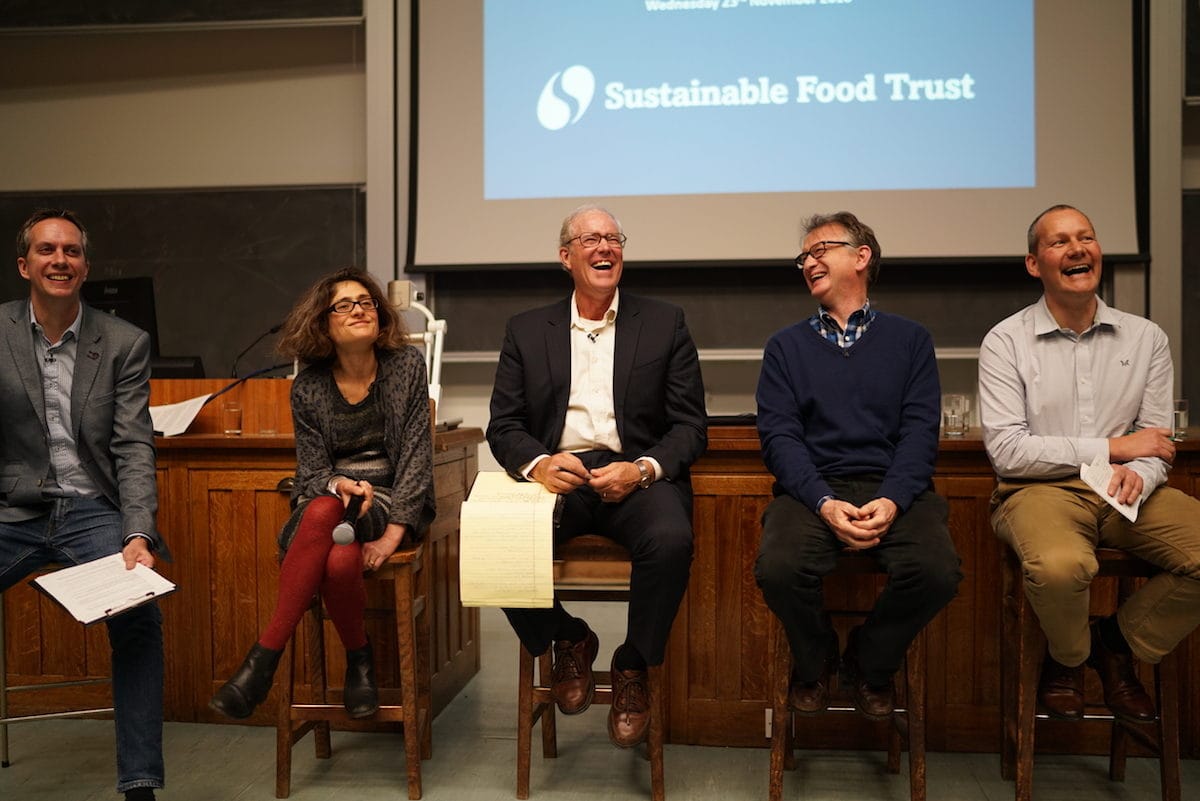 After Joel we heard from four panelists – each giving 5-minute presentations. The panelists included Tara Garnett (see 47 mins in above) – who initiated and runs the Food Climate Research Network. Simon Crichton (see 40 mins in) – an organic food expert with over 15 years of agricultural banking experience – who now heads the food, farming and trade team at Triodos Bank. Mark Eisler (see 34 mins in) – Chair in Global Farm Animal Health at the University of Bristol and Zoë Harcombe (see 55 mins in) – a researcher with a PhD in public health nutrition. These snappy and informative presentations led into a heated panel debate with Joel and Tara Garnett holding opposing and seemingly irreconcilable viewpoints, mainly around the benefits of holistic grazing.